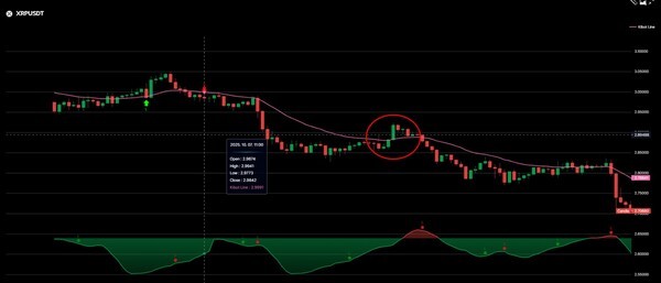 RisingX’s signals also performed reliably in XRP, where long-position liquidation rates were particularly high. After an S (Sell) signal was triggered on October 7, XRP fell by approximately 4.5%. On October 8, the price entered a brief consolidation phase accompanied by a deceptive rebound.
