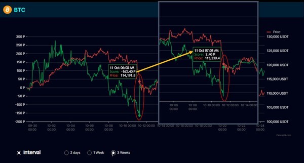 Even as prices continued to fall, the Score Chart displayed early signs of a trend reversal. Around 6:00 a.m. on October 11, the score line rebounded sharply toward the price line, narrowing the gap significantly. Approximately one hour later, at 7:00 a.m., downward pressure was effectively neutralized.
