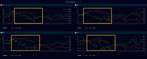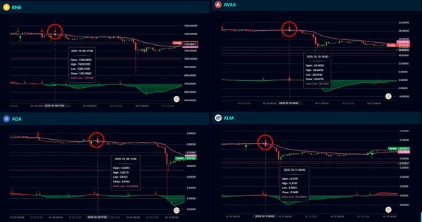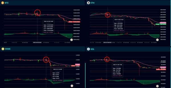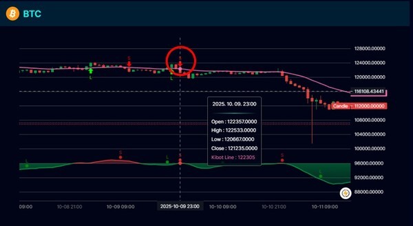 Even before the crash unfolded, RisingX had already detected persistent bearish signals by tracking capital movement patterns of major market players. As a result, during the crash phase, multiple S (Sell) signals appeared on the RisingX Kibot Chart starting around October 9. Shortly thereafter, Bitcoin entered a sharp decline on October 11 (KST).